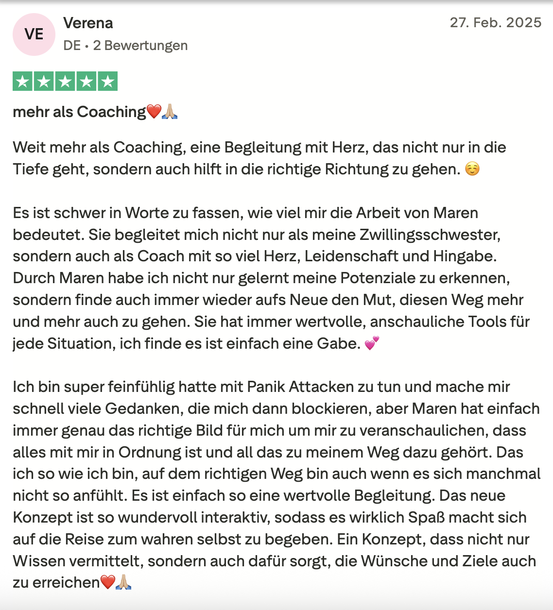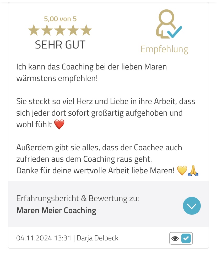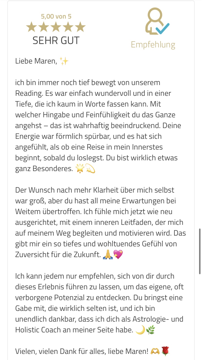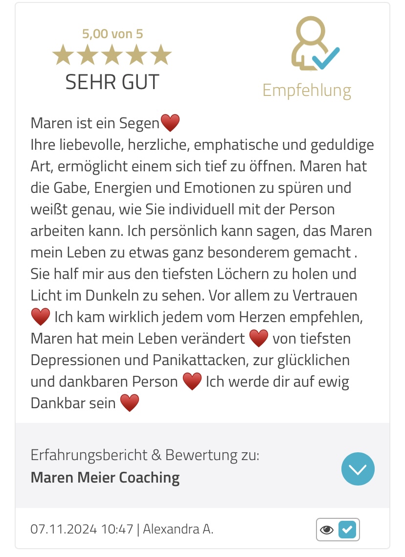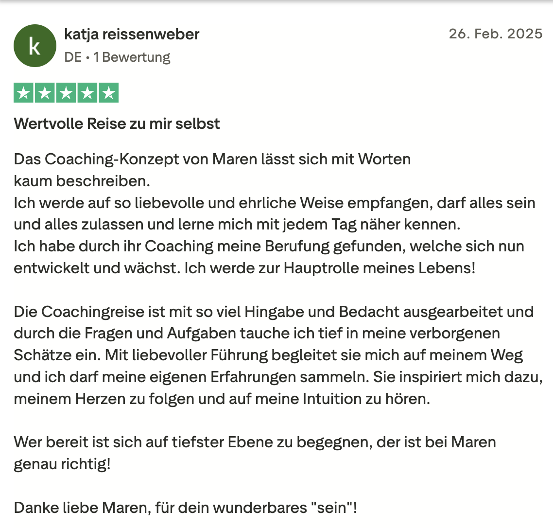 Ich heiße Maren – Mentorin für Berufung und tiefe Prozessbegleitung für Menschen, die spüren, dass da mehr in ihnen schlummert, als sie bisher leben. Es gab eine Zeit, in der ich mich selbst zurückhielt. Ich fühlte mich, zu feinfühlig, zu tief, zu viel für diese Welt. Aber genau das hat mich auf meinen Weg geführt: Raus aus dem Funktionieren – hinein in meine Berufung. Heute weiß ich: Berufung ist kein Ziel im Außen. Sie beginnt dort, wo wir bereit sind, unter unsere Schutzmechanismen zu fühlen – und unser Herz wieder weit zu öffnen, auch wenn es sich unsicher anfühlt.
